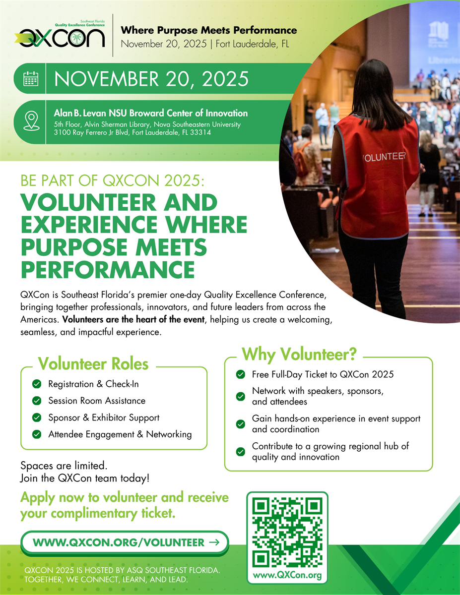 Join the movement toward quality excellence by volunteering at QXCON 2025, happening November 20 at NSU’s Levan Center of Innovation. We’re looking for enthusiastic professionals and students to help create a one-of-a-kind conference experience — from welcoming guests to supporting breakout sessions and speakers.
