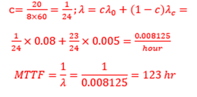 9. Night watchmen carry an industrial flashlight 8 hr per night, 7 nights per week. It is estimated that on the average the flashlight is turned on about 20 min per 8-hr shift[c]. The flashlight is assumed to have a constant failure rate of 0.08/hr while it is turned on and of 0.005/hr when it is turned off but being carried. In working hours, estimate the MTTF of the light.