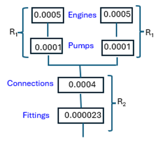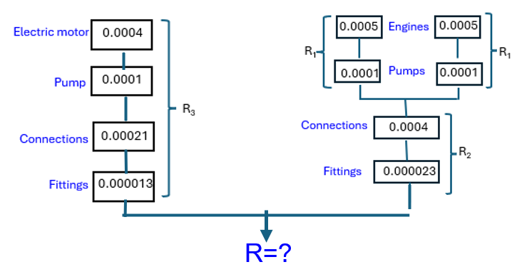 2. The Reliability of supplying hydraulic pressure to the junction point of the brake system of an aircraft: The engine’s power a hydraulic pump, which supplies to the hydraulic utility system. Each pump supplies the fluid volume and pressure required, so the pumps operate in parallel. First, calculate the Reliability of this system.
