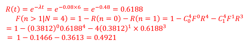 8. Suppose that amplifiers have a constant failure rate of λ = 0.08/month. Suppose that four such amplifiers are tested for 6 months. What is the probability that more than one of them will fail? Assume that when they fail, they are not replaced.
