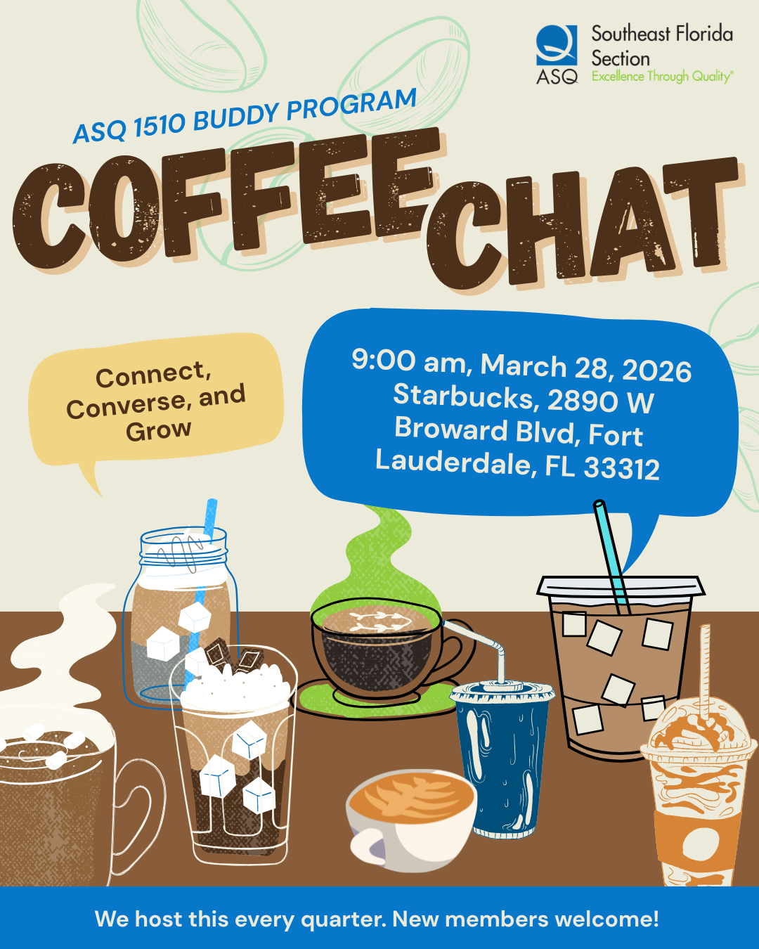 After connecting virtually, it's time to sit down face to face! Join ASQ Section 1510 for our Buddy Program Coffee Chat — Connect, Converse, and Grow!